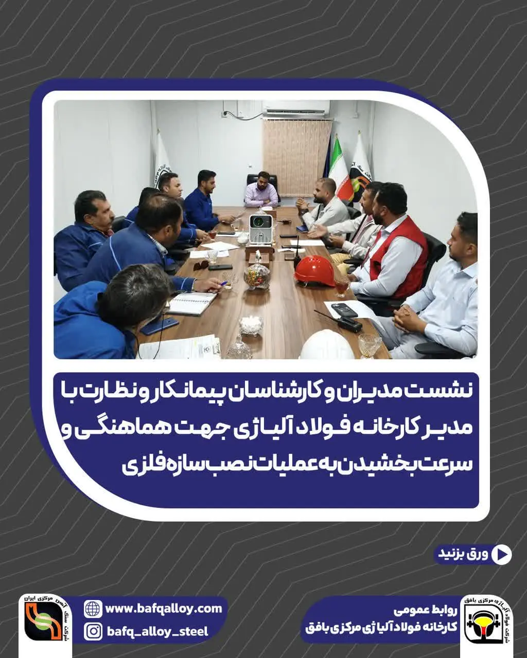 نشست پیمانکاران و مشاور پروژه با مدیر کارخانه فولاد آلیاژی در راستای هماهنگی و سرعت بخشیدن به عملیات نصب سازه های فلزی